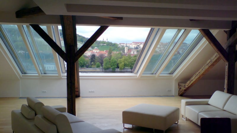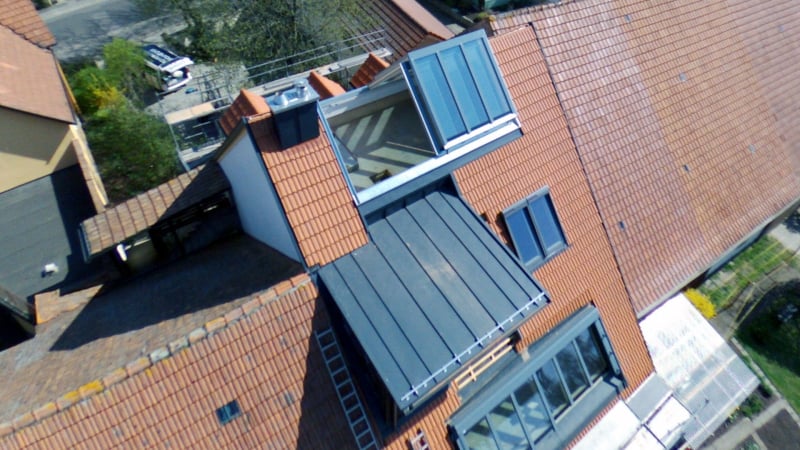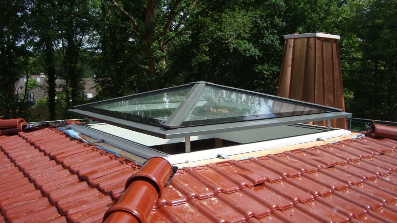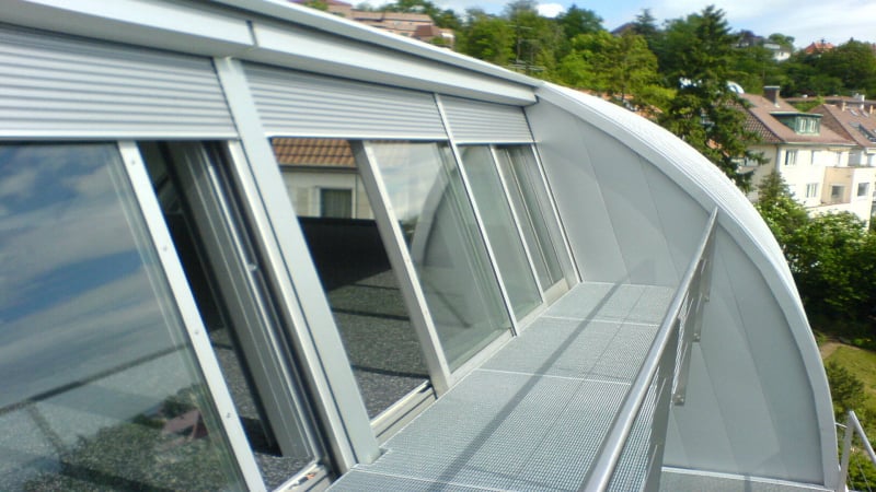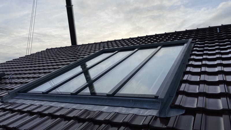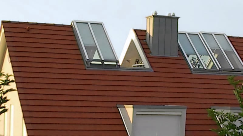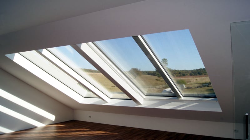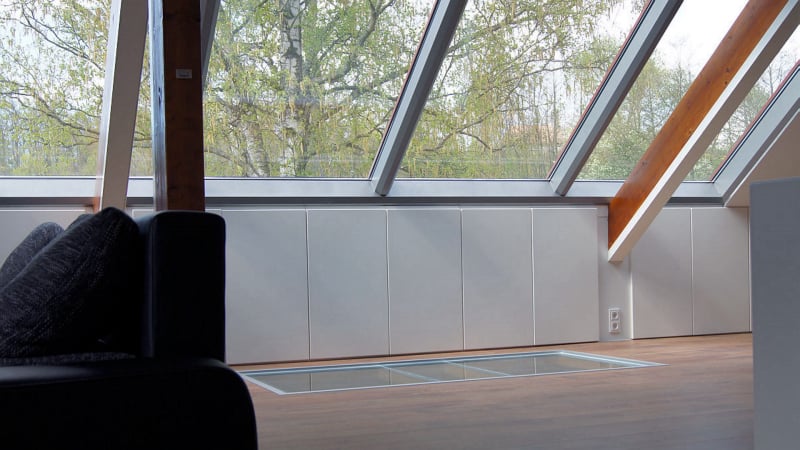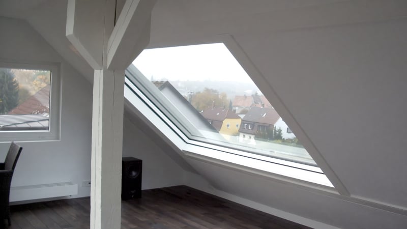 Winkelförmiges Fenster, das über beide Seiten des Dachfirstes geht. Mehr erfahren..