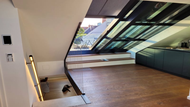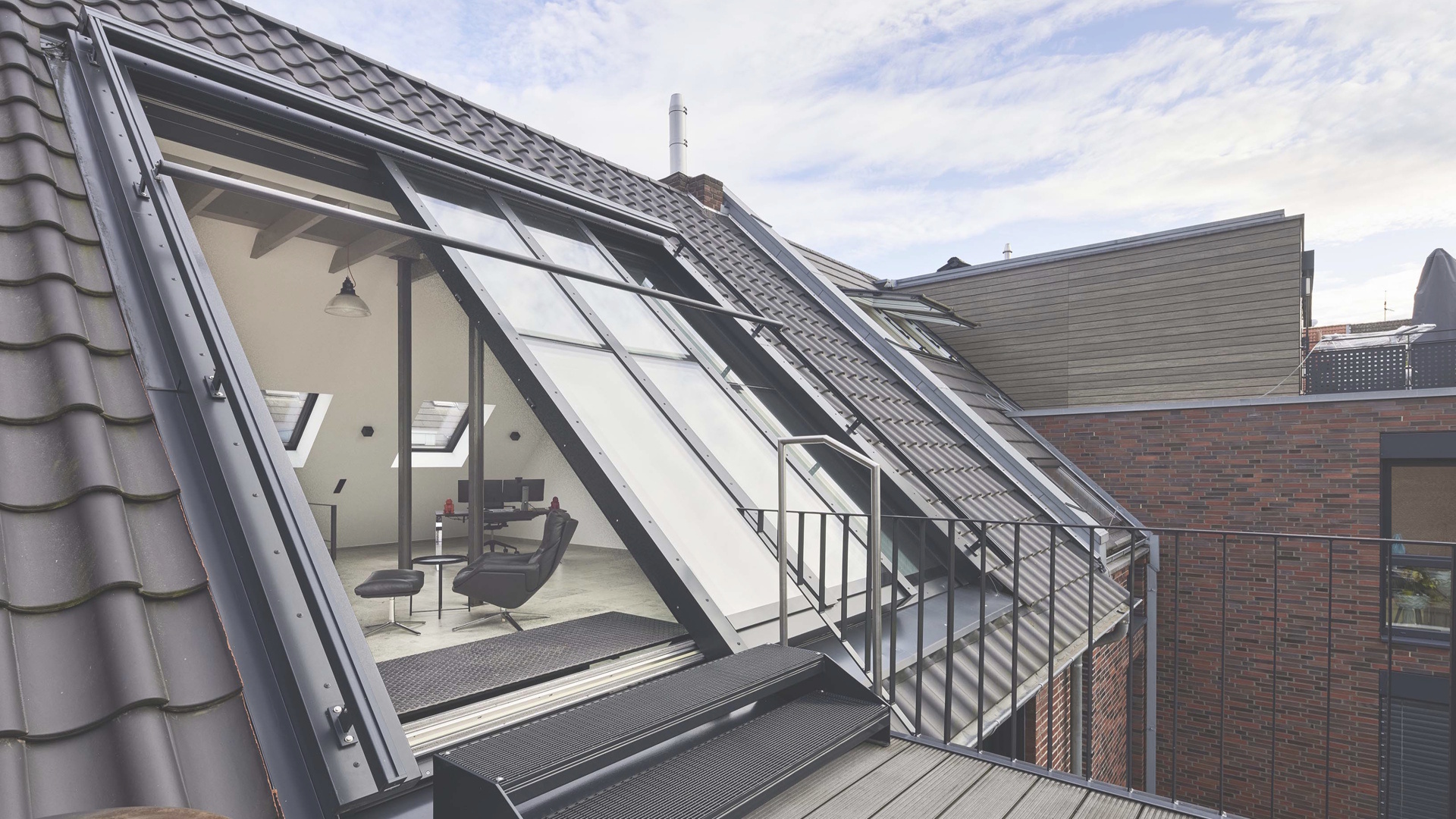 Das Hubschiebefenster kombiniert zwei bewegliche Elemente: Der erste Flügel hebt sich elektrisch an, der zweite gleitet anschließend elegant und platzsparend darunter. So verwandelt sich der Raum im geöffneten Zustand in einen Dachbalkon. Die von uns entwickelte Mechanik ist europaweit patentiert und steht exklusiv unseren Kunden zur Verfügung.
